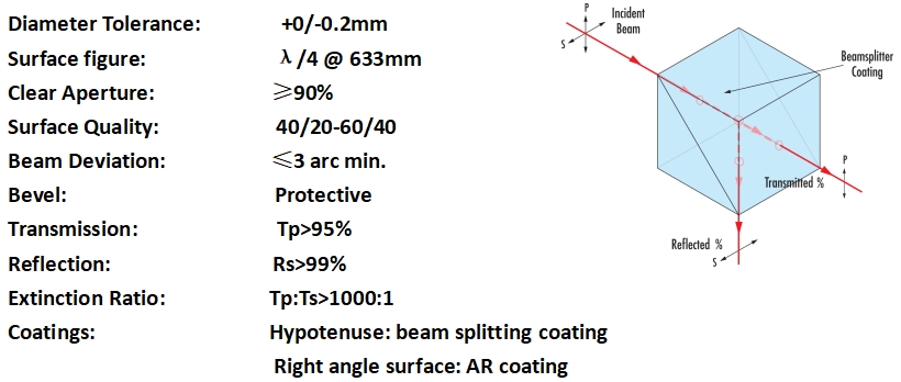 Polarizing Cube beamsplitter is designed to split light into reflected S-polarized and transmitted P-polarized beams.