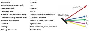 *The groove density, diffraction efficiency, damage threshold and substrate material can be custom produced based on different application and requests.
